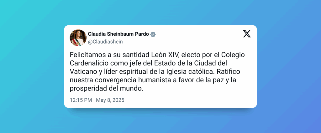 A través de su cuenta oficial en X (antes Twitter), la mandataria mexicana reconoció el trabajo realizado por el cónclave de cardenales y extendió su confianza en el liderazgo que ejercerá el nuevo pontífice, Robert Francis Prevost, tanto en la Iglesia católica como en el escenario internacional.