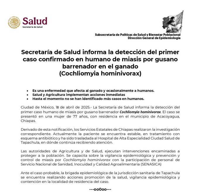 La Secretaría de Salud federal confirmó el primer caso en humano de miasis causada por el gusano barrenador del ganado (Cochliomyia hominivorax) en México. Se trata de una mujer de 77 años originaria de Acacoyagua, Chiapas, quien se encuentra estable y bajo tratamiento médico en Tapachula.
