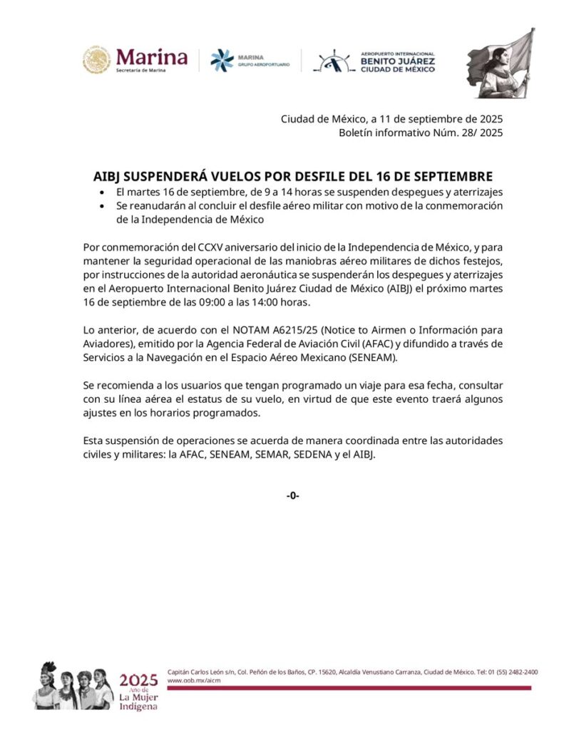 Los vuelos del 16 de septiembre se reanudarán en el AICM tras el Desfile Militar en la CDMX donde participarán paracaidistas y aviones de la Fuerza Aérea Mexicana.
