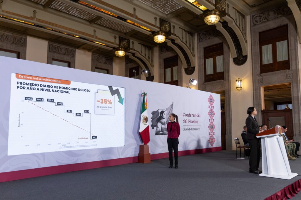 “La disminución en el número de homicidios diarios de septiembre de 2024 a noviembre de 2025, es del 37 por ciento, eso significa que en septiembre hubo 86.9 homicidios diarios y ahora estamos en un promedio de 54.7 homicidios dolosos diarios, una reducción del 37 por ciento. Es el noviembre más bajo desde 2015, incluso probablemente más; entre otros delitos que también han disminuido.