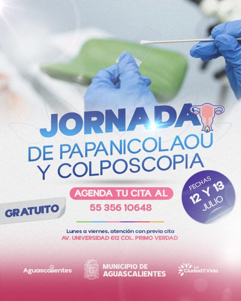 El Municipio de Aguascalientes, a través del DIF Municipal realizará jornadas gratuitas de estudios de papanicolaou y colposcopia los días 12 y 13 de julio, en sus instalaciones ubicadas en Avenida Universidad #612, Colonia Primo Verdad. La atención se brindará únicamente con cita, las interesadas podrán agendar llamando al teléfono 55 356 106 48.