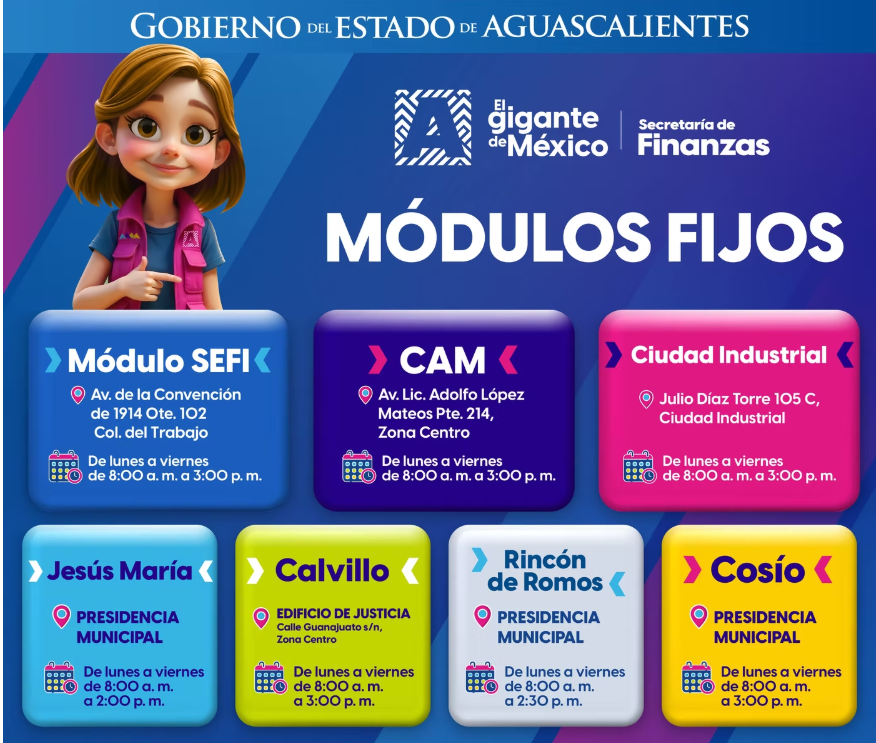 Para que puedas hacer tus trámites de forma más rápida y sencilla, la Secretaría de Finanzas del Estado (SEFI) pone a tu disposición siete módulos fijos de atención en la ciudad de Aguascalientes y en algunos municipios.