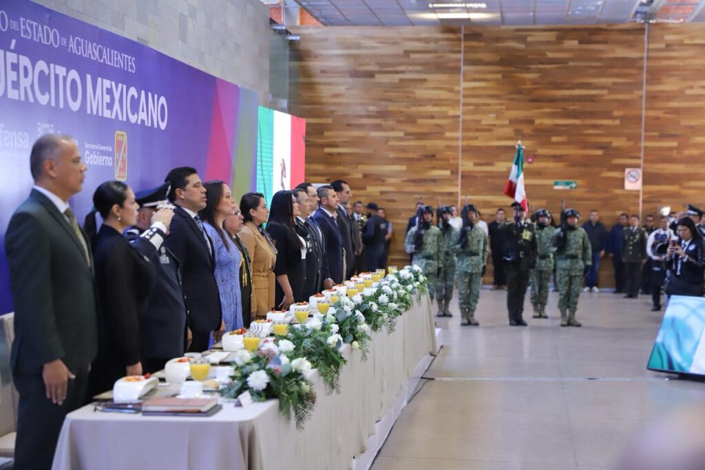“El Ejército representa lo que más queremos los mexicanos: paz social, seguridad y fuerza institucional; son los valores que defendemos juntos en Aguascalientes, trabajamos para que esa misión abrace a México bajo una sola bandera. Este instituto armado nació con la misión de garantizar la estabilidad de la patria a través de la lealtad, el honor y el amor a México. En estos 113 años, las mujeres y hombres que lo integran han sido los primeros en atender el llamado de la sociedad. Pertenecer al Ejército es un honor y una gran responsabilidad; ustedes son ejemplo de disciplina y compromiso; por eso, les reiteramos la total disposición para continuar con el trabajo coordinado y seguir sumando esfuerzos, porque el Ejército mexicano, la gran fuerza de México, es también la fuerza de Aguascalientes. Muchas felicidades”, expresó la gobernadora.