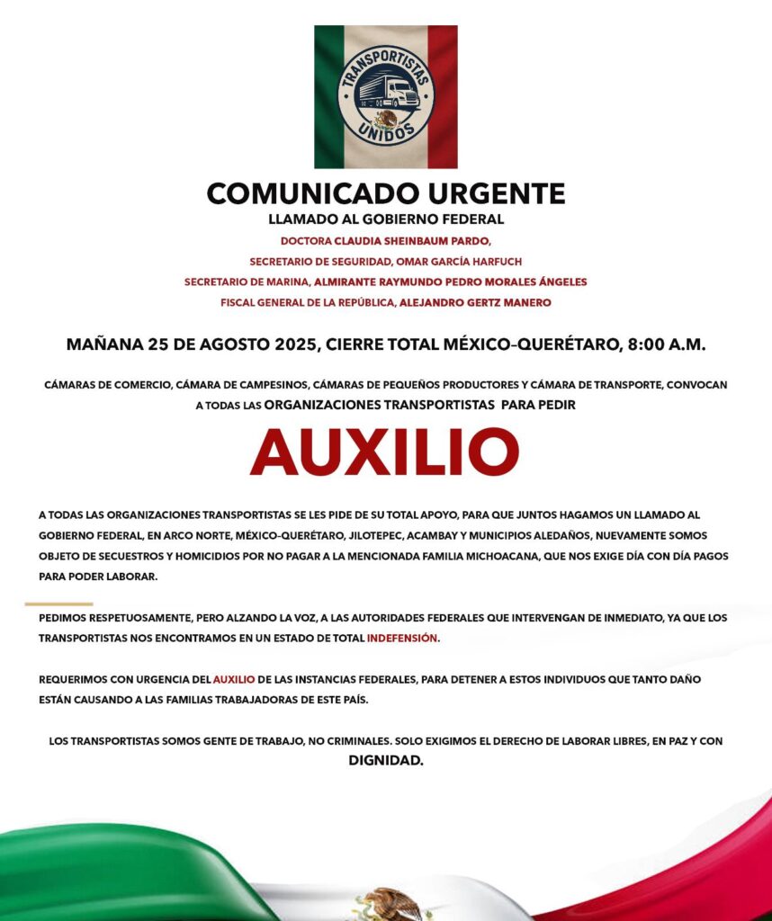 TRANSPORTISTAS BLOQUEAN LA AUTOPISTA MÉXICO–QUERÉTARO ESTE 25 DE AGOSTO PARA EXIGIR JUSTICIA