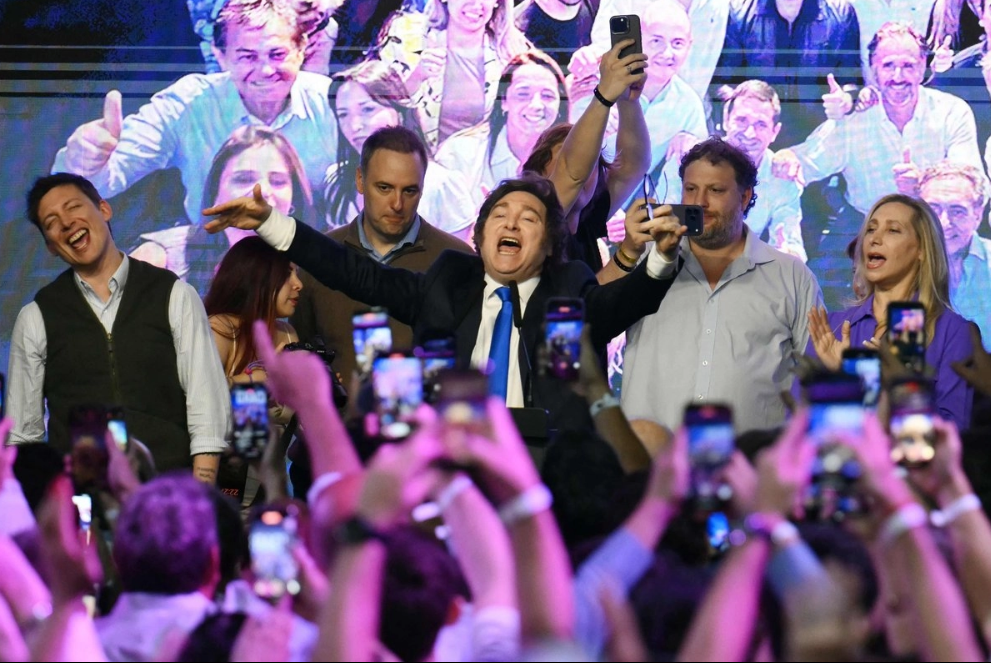El presidente de Argentina, Javier Milei (centro), celebra junto a su asesor Santiago Caputo (izquierda), el portavoz de la presidencia, Manuel Adorni (tercero por la izquierda), y su hermana, la secretaria general de la presidencia, Karina Milei (derecha), en el búnker del partido gobernante