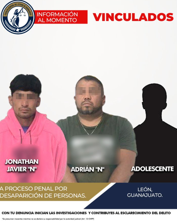 La Fiscalía del Estado de Guanajuato informó sobre la vinculación a proceso de dos hombres y un menor, acusados de la presunta desaparición de personas en León. Los detenidos, identificados como Jonathan Javier ‘N’ y Adrián ‘N’, de 23 y 40 años, y un adolescente cuya identidad no fue revelada, fueron arrestados el 27 de marzo al ser sorprendidos trasladando un cuerpo en la cajuela de un vehículo.